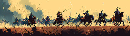 A wide-angle depiction of an epic battlefield scene at dawn, showcasing silhouetted warriors on horseback engaging in combat. The sky, a canvas of muted yellows and blues, highlights the dust and debris of the clash. This illustration would fit into historical narratives or thematic visual storytelling.