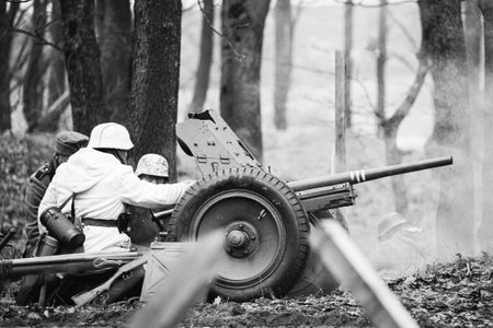 Re-enactors Dressed As German Soldiers In WWII Load A Cannon Shells At Firing Position. Historical Reenactment