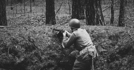 Black and White Soldier Aiming in the Historical Forest. Soviet Russian Soldier Aiming With Rifles. Soldiers Shoots With Rifle. Soviet Russian Soldier Uniform