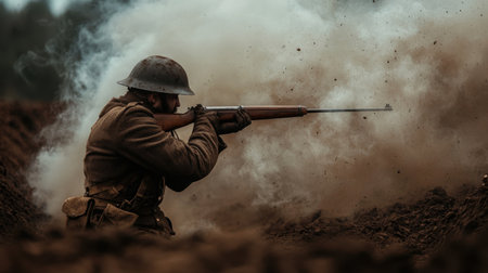 A soldier in World War One is seen firing a rifle amidst swirling smoke and dust, encapsulating the intense atmosphere of battle and moments of valor in history.