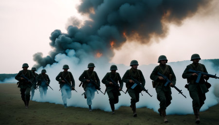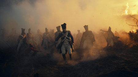 Soldiers in vintage uniforms advance bravely through billowing smoke on the battlefield in a scene evoking historical warfare.. AI Generation