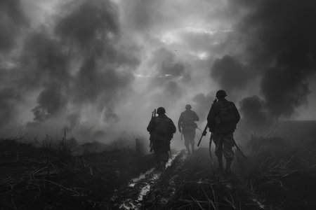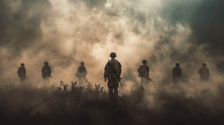 Soldiers in foggy field, creating dramatic atmosphere