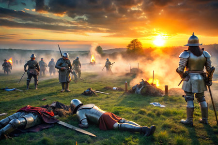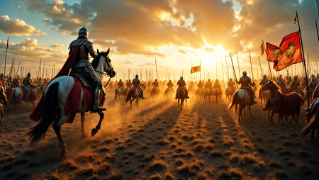 Medieval Knights on Horseback Charging into Battle at Sunset..