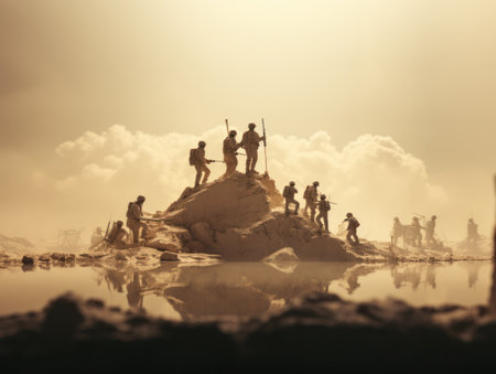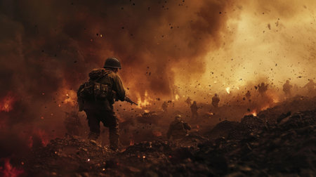 A group of soldiers bravely marches forward, silhouetted against a fiery sky and thick smoke. The early morning light reveals their determination amidst the chaos of battle.