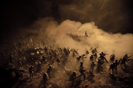 War Concept. Military silhouettes fighting scene on war fog sky background, World War Soldiers Silhouettes Below Cloudy Skyline At night. Attack scene. Armored vehicles. Selective focus. Decoration