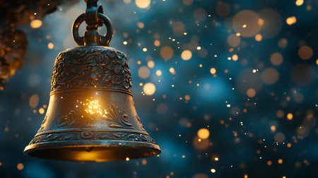 A beautifully detailed bronze bell emits a warm glow amidst festive lights and bokeh, creating a magical, celebratory atmosphere.