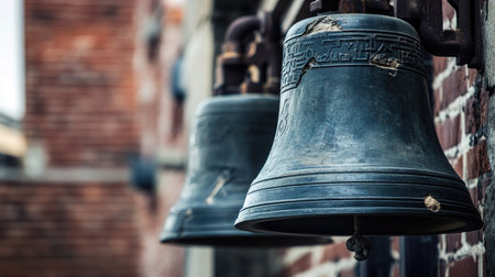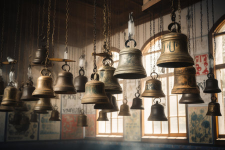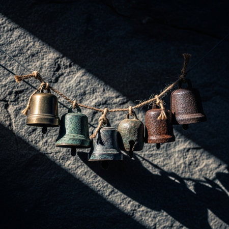 Captivating image of bronze bells casting shadows against a textured wall, creating a serene atmosphere. A beautiful blend of tradition and artistry in a peaceful setting.
