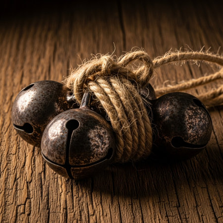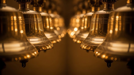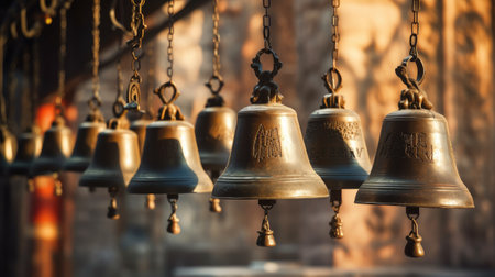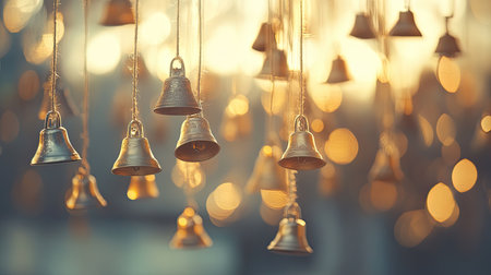 A captivating image of decorative bells suspended in mid-air, glowing in warm light with a soft bokeh background, evoking feelings of joy and serenity.