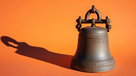 A vintage bell stands prominently on a bright orange background, creating a striking visual contrast. The intricate design and shadow add depth, making this image a perfect representation of rustic charm and historical artifacts.
