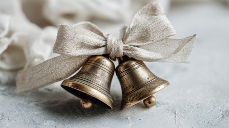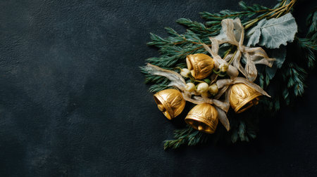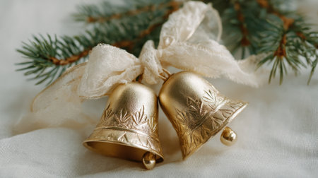 Two elegant gold bells tied with a soft ribbon rest beside vibrant pine branches, creating a festive atmosphere perfect for holiday decor and winter celebrations.