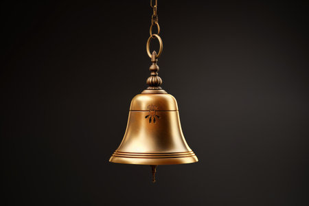 Brass Bell Hanging From Chain. A brass bell with intricate patterns is suspended from a chain, creating a striking visual contrast. The bell is stationary, reflecting light and shadows.