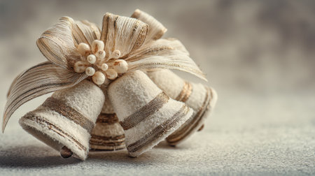 A detailed close-up of decorative Christmas bells adorned with a beautiful ribbon and pearls, ideal for enhancing any festive atmosphere and holiday decor.
