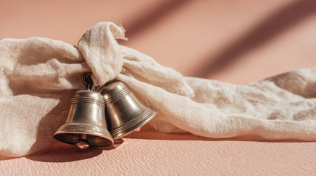 Golden bells hanging against copy space background. Bells are in focus, with their intricate details. Image evokes a sense of celebration and festivity, making it perfect for holiday-themed projects