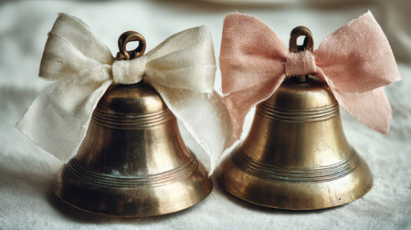 Two beautiful antique bells adorned with soft pastel bows create a charming and delicate decorative element perfect for various occasions and themes.