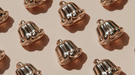 A stunning display of golden decorative bells in a precise grid layout, creating an elegant visual with dynamic shadows, perfect for enhancing festive themes and designs.