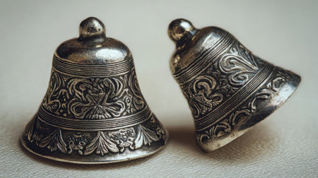 Two beautiful antique silver bells with intricate floral patterns showcase exquisite craftsmanship. Perfect for collectors and decorative displays in various settings.