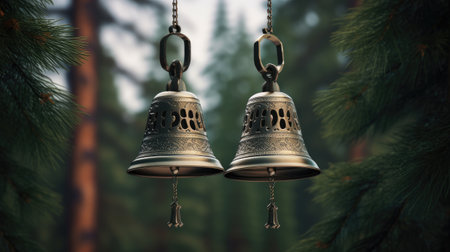 metal Orthodox church bells, a bottom view of the church bells against a background of green pine branches, emphasize the beauty and simplicity of the religious elements