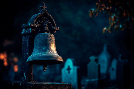 An antique church bell with a cross looms in a fog-covered cemetery at night, encircled by weathered stone tombs that evoke a haunting atmosphere
