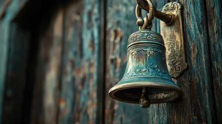 A close-up of a vintage brass bell hanging from a wooden frame, with intricate detailing and a rustic background, evoking a classic, nostalgic feel.