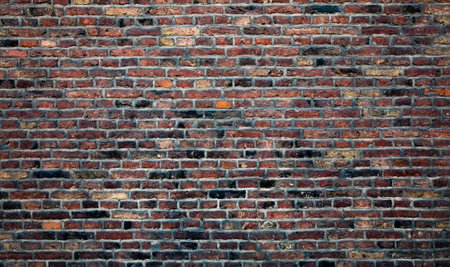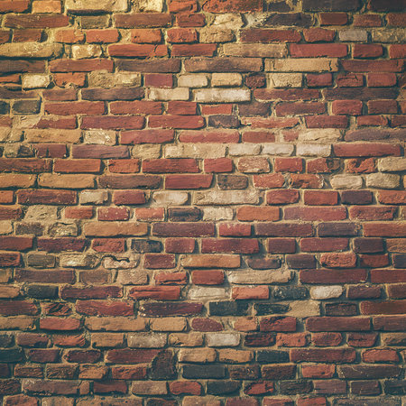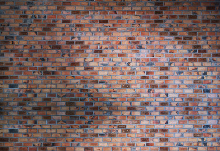 Detailed close-up of a weathered red brick wall with visible mortar, showing rustic textures and urban architectural charm.