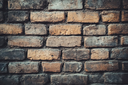 Detailed view of brick wall texture, weathered with natural wear, capturing the rugged beauty of aged brick in soft lighting.