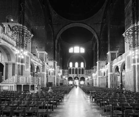 Rows of seats and decorative floor of the aisle of the central nave of a church - Black and White.