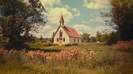 Picturesque white church, set against a backdrop of wildflowers, stands in a rural landscape. The church features a copper-colored steeple and wooden doors, with windows along the exterior walls. The foreground shows a vibrant field of flowers, adding a touch of natural beauty to the scene.