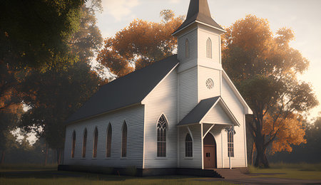 A serene church atop rolling hills, bathed in the warm glow of a sunset, creating a peaceful and spiritual landscape. AI Generation