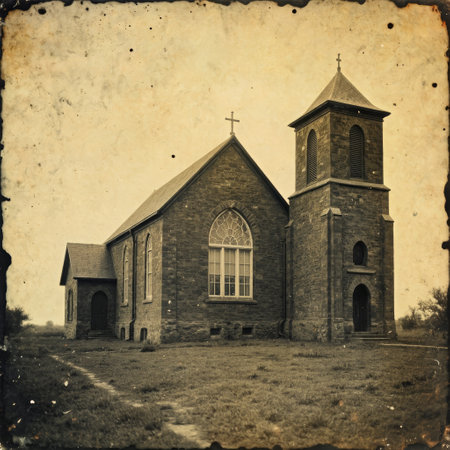 Old stone church with a tall spire and stained glass windows, a symbol of faith and history.