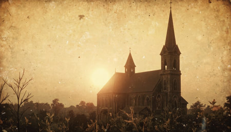 Vintage photo of the cathedral at sunset, silhouetted against the sky. Sepia, aging effect, scuffs. The atmosphere of the past, retro style, historical setting.