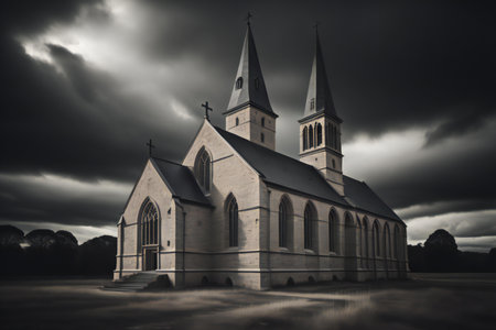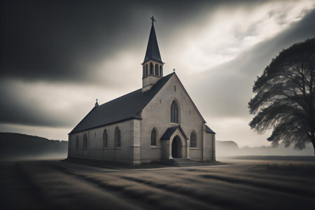 Church in the countryside with dramatic sky. Black and white image. generative ai