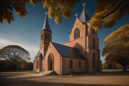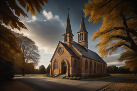 Church in autumn with yellow maple leaves and blue sky background. generative ai