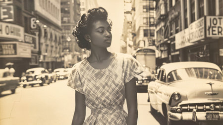 A Moment of Reflection on a Busy City Street in the 1950s.