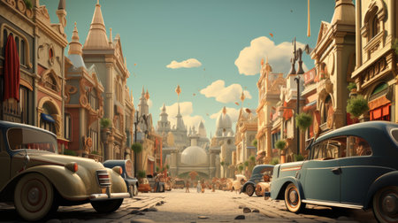 A nostalgic cityscape featuring a speakeasy advertisement and classic cars on a bustling street