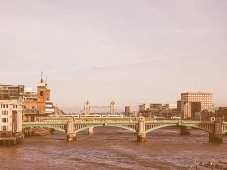 Panoramic view of River Thames in London, UK at sunset vintage