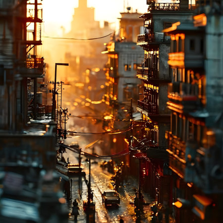 Aerial view of a bustling cityscape with modern skyscrapers and landmarks, bathed in golden sunlight.
