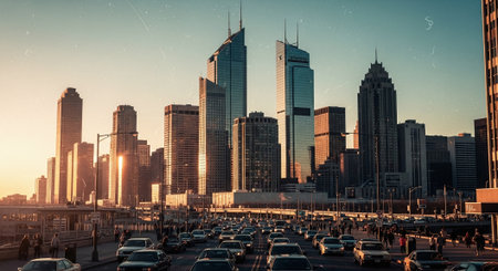 cityscape with view of modern high-rise buildings and bustling street scene, created with generative ai