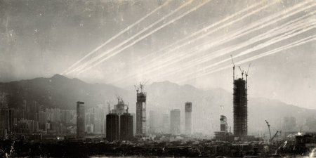 An aerial view presents a monochrome cityscape dominated by construction activities. Structures reach towards the sky, punctuated by illuminated trails in the atmosphere. The composition emphasizes lines and shapes, with a contrast of light and shadow, suggesting a day setting. Suitable for various commercial and editorial applications.