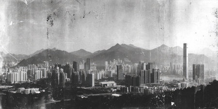 A grayscale cityscape presents a collection of tall buildings under a sky marked by visible contrails. The composition features high-rise structures against distant hills, suggesting an urban or suburban environment. The image uses a vintage style that could be utilized for various commercial and editorial projects.