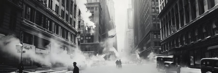 A black and white photo of a city street with tall buildings, AI