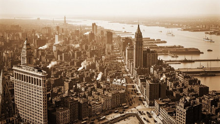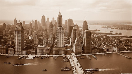A sepia-toned, vintage aerial captures the sprawling New York City skyline in the early 20th century. Numerous skyscrapers and buildings fill the frame, with the iconic Statue of Liberty visible in the distance across the harbor. Ships and boats navigate the busy waterways, while vintage cars and horse-drawn carriages traverse the streets below. This historical panorama offers a glimpse into the bustling urban landscape and industrial might of early New York City, showcasing its...