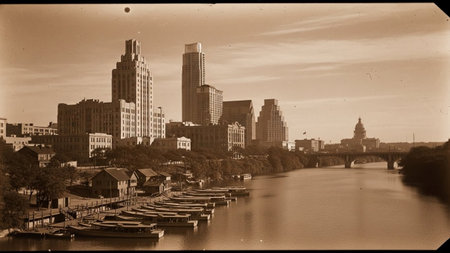 A sepia-toned panoramic captures a historic city skyline situated along a broad river. Numerous buildings of varying heights, including distinct skyscrapers, form the urban backdrop. Along the river's edge, a dock is lined with many small boats, suggesting a bustling waterfront. Trees are visible along the riverbank, and a bridge spans the water in the distance. The sky is partly cloudy, with sunlight illuminating the scene, casting reflections on the water. The overall aesthetic is vintage...
