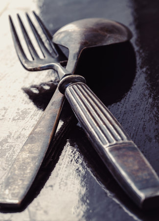 Ancient worn vintage cutlery on the dark background. Crossed black metal spoon and fork in dark tone, Highlighting its texture and design, use it as your Space for text, Design, Wallpaper and Poster, Selective focus.