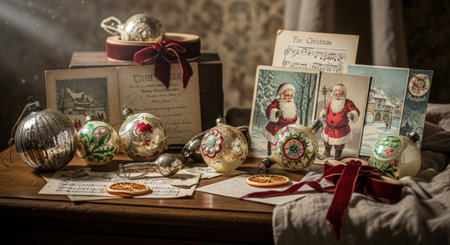 Vintage postcards on the wooden table with Christmas decorations. Selective focus.