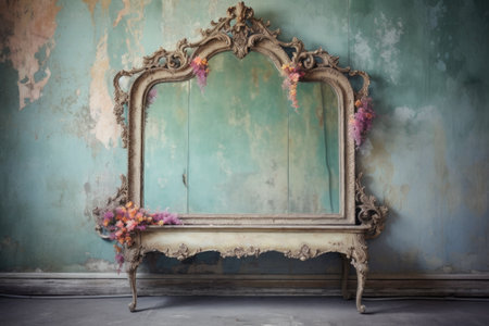 pastel-toned ornate mirror hanging on a distressed wall