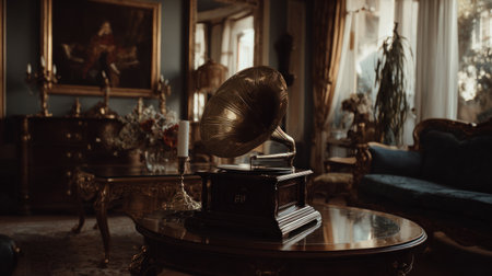 A classic gramophone sits on a table in a dimly lit room, featuring dark-colored furniture and ornate decor. Warm lighting highlights the gramophone and surrounding objects. The scene evokes a sense of history and nostalgia, potentially suitable for various commercial or editorial applications.