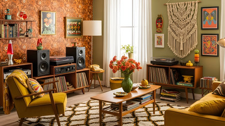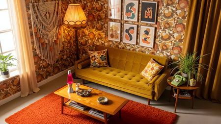 This image depicts a cozy and vibrant living room with a strong retro aesthetic. The room features a mustard yellow sofa adorned with colorful throw pillows. A wooden coffee table sits in front of the sofa, holding a few decorative items. The walls are decorated with an array of framed art and a macrame hanging. A tall floor lamp with a yellow shade stands beside the sofa, adding to the warm lighting. The room is further embellished with potted plants, a woven rug, and curtains that complement the overall vintage theme.