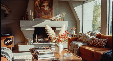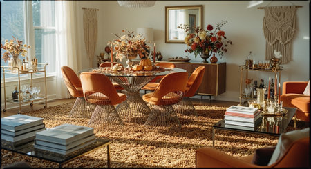 A retro living room featuring orange furniture, a glass coffee table with autumn decorations, and large plants, creating a warm and inviting atmosphere