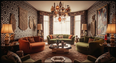 A stylish mid-century modern living room featuring bold colors, unique furniture shapes, and artistic decor elements