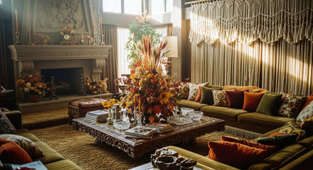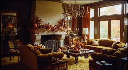 A cozy, elegantly decorated living room with a fireplace, adorned with autumn decorations including pumpkins and floral arrangements, warm lighting, and rich colors